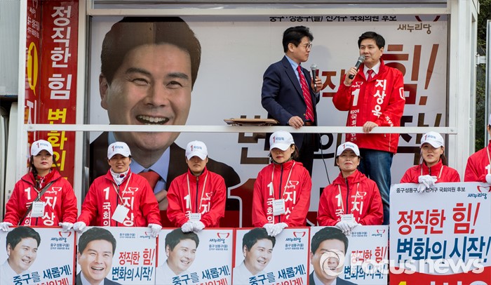 (서울=포커스뉴스) 5일 오후 서울 중구 약수시장 인근에서 지원유세를 가진 지상욱 새누리당 중구성동구을 후보가 유권자들에게 지지를 호소하고 있다.