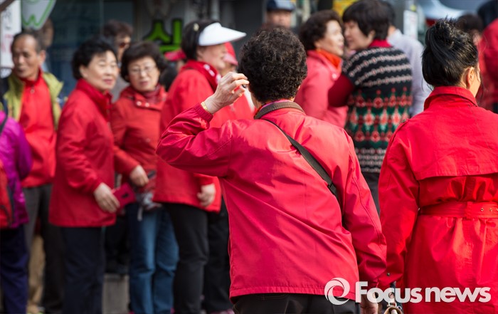 (서울=포커스뉴스) 5일 오후 서울 중구 약수시장 인근에서 열린 지상욱 새누리당 중구성동구을 후보 선거유세에서 지 후보 지지자들이 붉은 상의를 입고 모여있다.