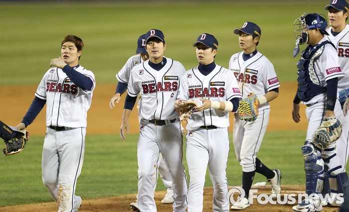 (서울=포커스뉴스) 5일 서울 잠실구장에서 열린 2016프로야구 NC-두산 경기에서 홈개막전을 승리로 장식한 두산 선수들이 마운드에서 덕아웃으로 향하고 있다.