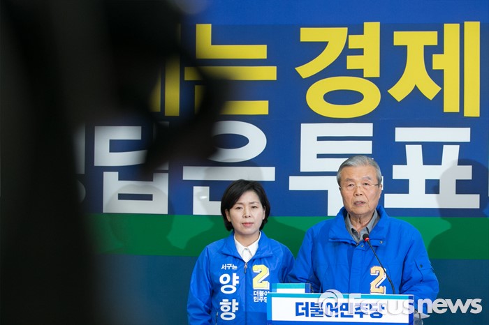 (서울=포커스뉴스) 김종인(오른쪽) 더불어민주당 비대위 대표가 6일 오전 서울 여의도 국회 당대표회의실에서 광주경제살리기 특별기자회견을 하고 있다. 왼쪽은 양향자 광주 서구을 후보.
