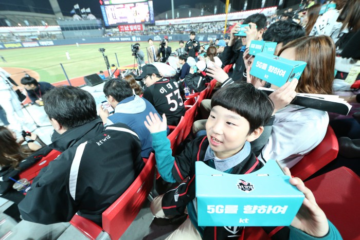 (서울=포커스뉴스) KT는 지난 5일 수원 kt 위즈파크(wiz park)에서 열린 프로야구 kt위즈 홈 개막전에서 기가 가상현실(VR) 모바일 야구 생중계를 제공했다.