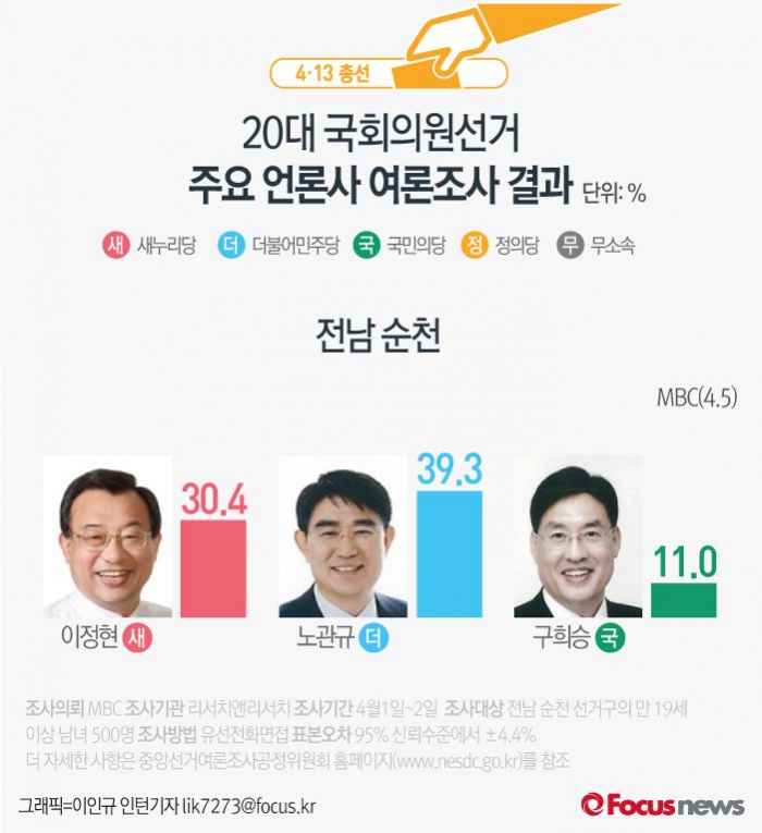 (서울=포커스뉴스) MBC가 여론조사기관 리서치앤리서치에 의뢰해 5일 발표한 결과에 따르면 전남 순천의 지지율은 새누리당 이정현 후보(30.4%), 더불어민주당 노관규 후보(39.3%), 국민의당 구희승 후보(11.0%) 순인 것으로 나타났다.