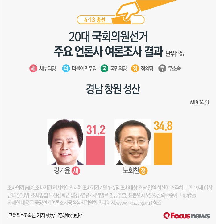 또 경남신문이 여론조사기관 한국갤럽에 의뢰해 4일 발표한 결과에서는 강기윤 후보가 36.6%로 노회찬 후보(33.2%)에 3.4%p 앞서는 것으로 조사됐다.
