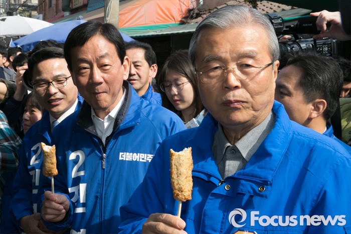 (서울=포커스뉴스) 김종인(오른쪽) 더불어민주당 비대위 대표 겸 선대위원장과 진영 서울 용산구 후보가 6일 오전 용문시장을 방문해 어묵을 맛보고 있다.