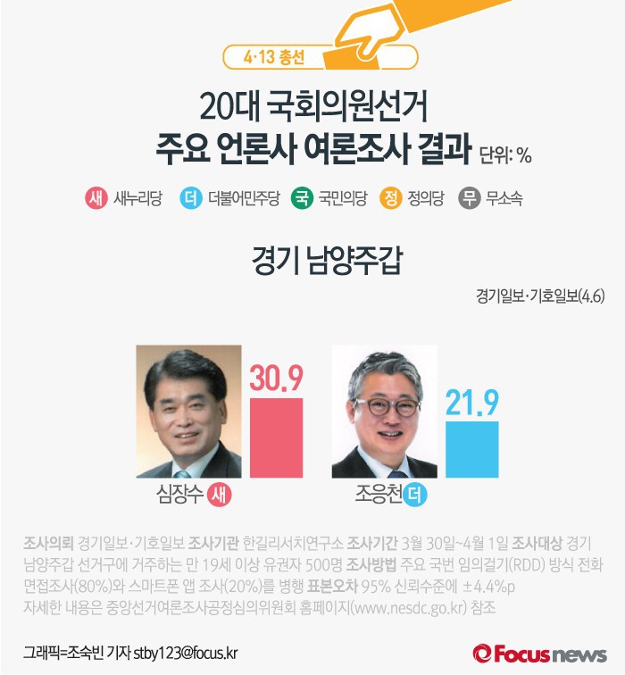 (서울=포커스뉴스) 경기일보·기호일보가 공동으로 여론조사기관 한길리서치연구소에 의뢰해 6일 발표한 결과에 따르면 경기 남양주갑의 후보지지도는 새누리당 심장수 후보(30.9%), 더민주 조응천 후보(21.9%) 순인 것으로 나타났다.