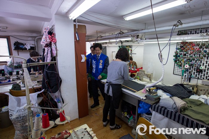 (서울=포커스뉴스) 노웅래 더불어민주당 마포구갑 후보가 6일 오전 서울 마포구 봉제공장을 찾아 선거운동을 하고 있다.