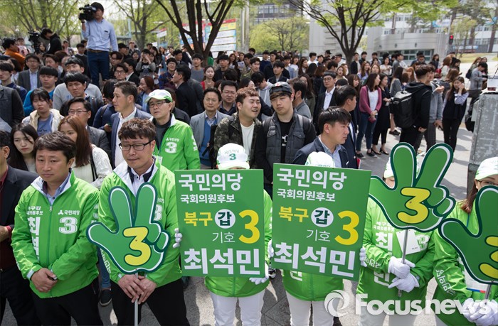 (대구=포커스뉴스) 대구지역 유권자들이 6일 오후 대구광역시 북구 경북대학교 앞에서 최석민 대구 북구갑 후보 선거 유세를 지켜보고 있다.