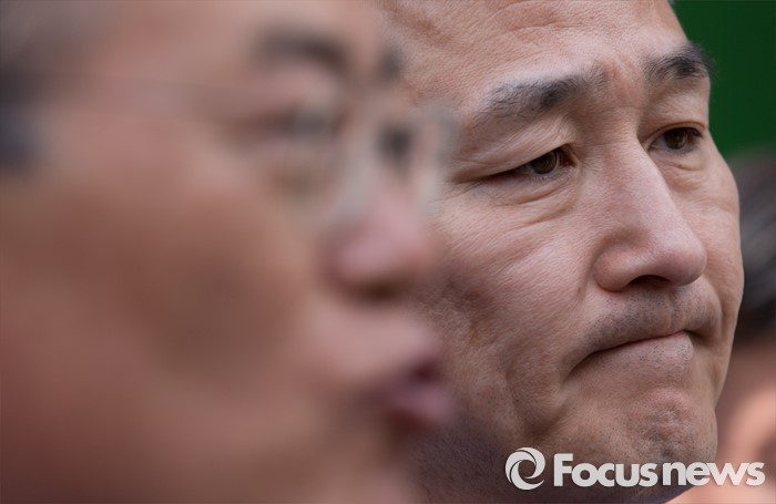 (용인=포커스뉴스) 6일 오전 경기 용인 기흥구 보정동 카페거리에서 표창원 더민주 용인시정 후보가문재인 더불어민주당 전 대표의 말을 경청하고 있다.