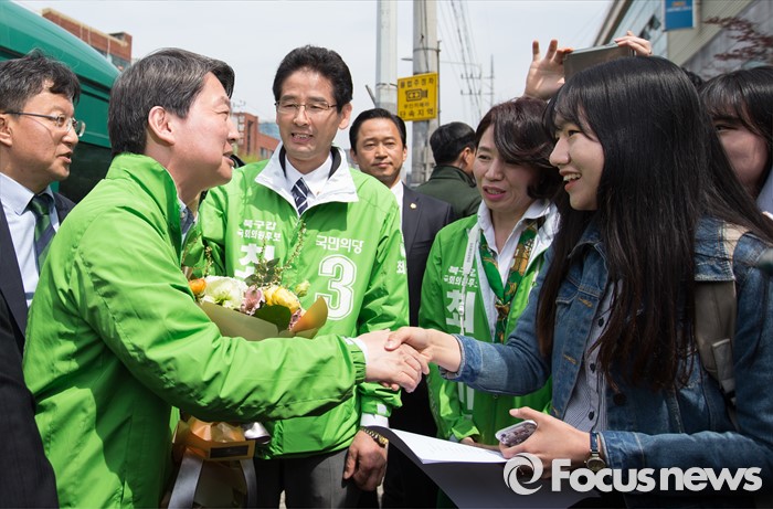 (대구=포커스뉴스) 안철수 국민의당 상임공동대표가 6일 오후 대구광역시 북구 경북대학교 앞에서 최석민 대구 북구갑 후보 지원유세를 하던 중 한 여대생과 인사하고 있다.