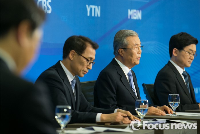 (서울=포커스뉴스) 김종인(왼쪽 세번째) 더불어민주당 비대위 대표 겸 선대위원장이 6일 오후 서울 종로구 세종문화회관에서 열린 한국방송기자클럽 초청 토론회에 참석해 모두발언을 하고 있다.