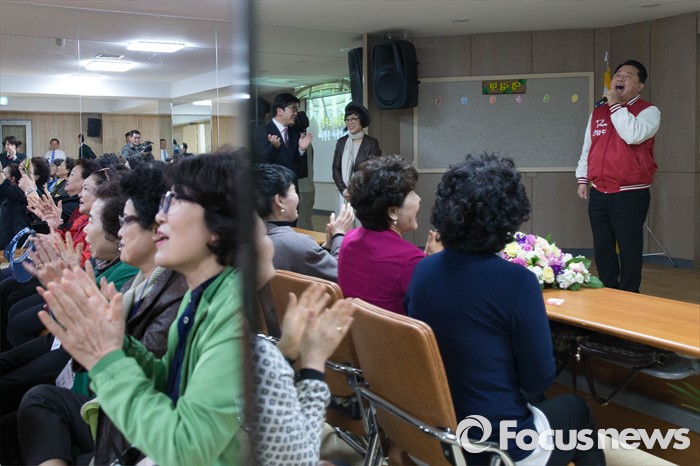 (서울=포커스뉴스) 총선을 일주일 앞둔 6일 오후 서울 강서구의 한 노래교실을 찾은 구상찬 새누리당 강서구갑 후보가 지지를 호소하고 있다.
