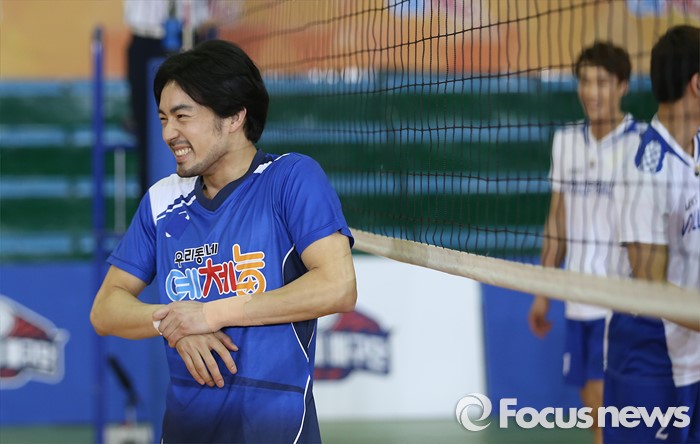 (서울=포커스뉴스) 6일 오후 서울 강서구 KBS스포츠월드에서 열린 예능프로그램 '우리동네 예체능' 촬영현장 공개 행사에 참여한 배우 오타니 료헤이(왼쪽)이 스파이크 공격을 수비 한 후 손목을 만지고 있다.