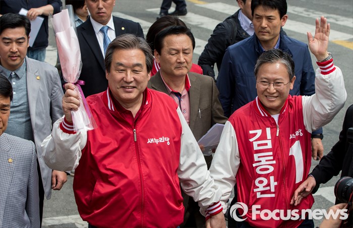 (당진=포커스뉴스) 6일 오후 충남 당진 구 버스터미널 사거리에서 김무성(왼쪽) 새누리당 대표가 김동완 당진시 후보의 손을 잡고 지원유세장으로 향하고 있다.