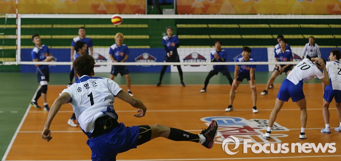 (서울=포커스뉴스) 6일 오후 서울 강서구 KBS스포츠월드에서 열린 예능프로그램 '우리동네 예체능' 촬영현장 공개 행사에 참여한 배구선수 송명근이 서브를 하고 있다.