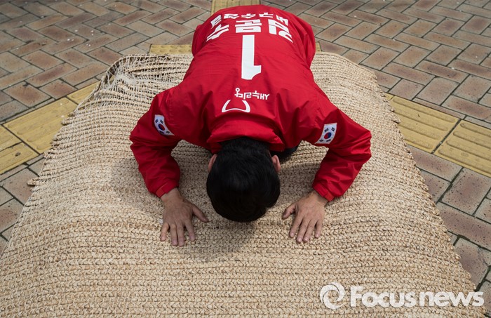 (대구=포커스뉴스) 김문수 새누리당 수성구갑 후보가 6일 오후 대구광역시 수성구 범어네거리에서 새누리당 공천 잘못과 대구 경제 못 살린것을 사죄한다며 절을 하고 있다.