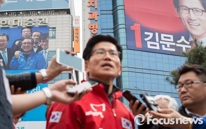 (대구=포커스뉴스) 김문수 새누리당 수성구갑 후보가 6일 오후 대구광역시 수성구 범어네거리에서 새누리당 공천 잘못과 대구 경제 못 살린것에 대해 백배 사죄의 절을 마친 후 인터뷰하고 있다.