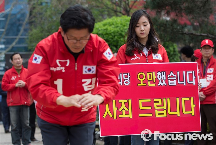 (대구=포커스뉴스) 김문수 새누리당 수성구갑 후보가 6일 오후 대구광역시 수성구 범어네거리에서 새누리당 공천 잘못과 대구 경제 못 살린것을 사죄한다며 절을 하고 있다.