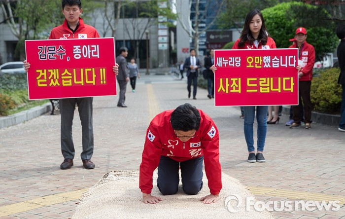(대구=포커스뉴스) 김문수 새누리당 수성구갑 후보가 6일 오후 대구광역시 수성구 범어네거리에서 새누리당 공천 잘못과 대구 경제 못 살린것을 사죄한다며 절을 하고 있다.