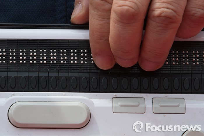 (서울=포커스뉴스) 6일 오후 서울 영등포구 국회의사당역 인근에서 열린 '장애인 정치 참여보장을 위한 범장애계 총궐기대회'에서 한 참석자가 점자정보단말기를 이용해 발언을 하고 있다.