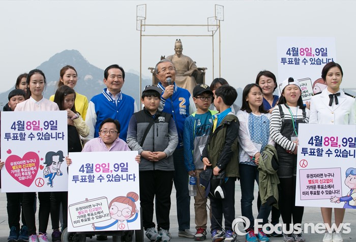 한편 사전투표제는 지난 2013년 4‧24 재·보궐 선거 때 처음 도입됐으며 전국단위 국회의원 선거로는 이번 4‧13 총선에서 처음 실시된다.김종인 더불어민주당 비대위 대표 겸 선대위원장이 6일 오후 서울 광화문광장에서 정세균 종로구 후보, 비례대표 후보, 창원 봉강초등학교 학생들과 20대 총선 사전투표 캠페인을 하고 있다. 2016.04.06 박동욱 기자