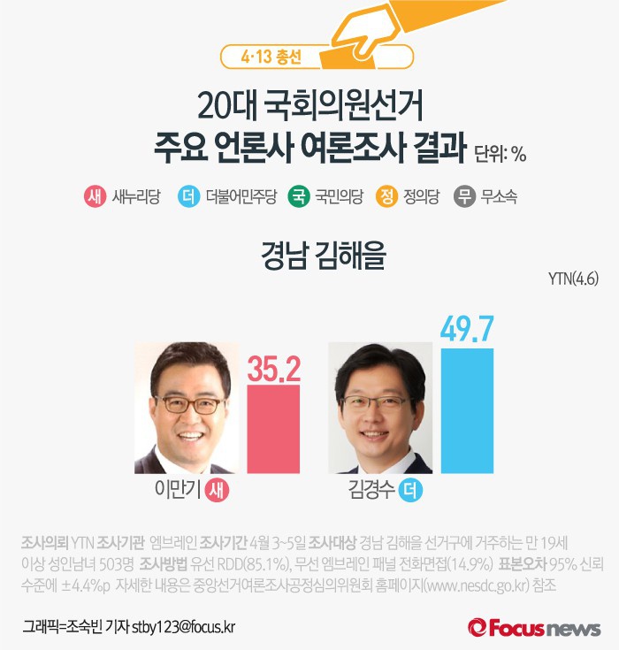 (서울=포커스뉴스) YTN이 여론조사기관 엠브레인에 의뢰해 6일 발표한 결과에 따르면 경남 김해을에서 새누리당 이만기 후보의 지지율은 35.2%, 더민주 김경수 후보의 지지율은 49.7%인 것으로 나타났다.