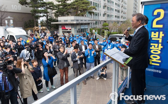 (수원=포커스뉴스) 6일 오후 경기 수원시 영통구 매탄1동 주민센터 앞에서 문재인 더불어민주당 전 대표가 박광온 더민주 수원시정 후보 지원유세를 하고 있다.