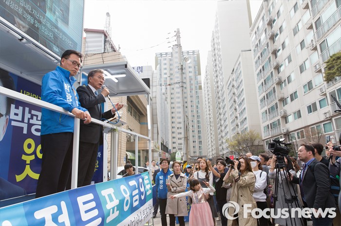 (수원=포커스뉴스) 6일 오후 경기 수원시 영통구 매탄1동 주민센터 앞에서 문재인 더불어민주당 전 대표가 박광온 더민주 수원시정 후보 지원유세를 하고 있다.