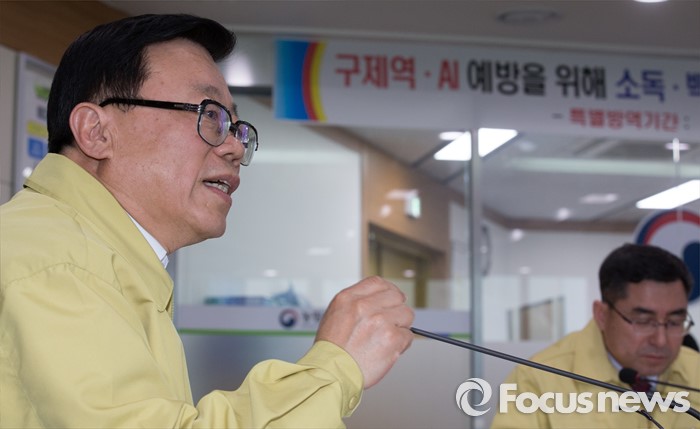 (세종=포커스뉴스) 이동필 농림축산식품부 장관이 6일 오후 세종시 정부세종청사 농식품부 방역대책상황실에서 가축방역 상황점검회의를 열고 회의를 주재하고 있다.