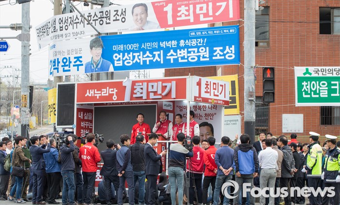 (천안=포커스뉴스) 6일 오후 충남 천안 두정로에서 최민기 새누리당 천안시을 후보 지원유세에 나선 김무성 대표가 유권자들에게 지지를 호소하고 있다.