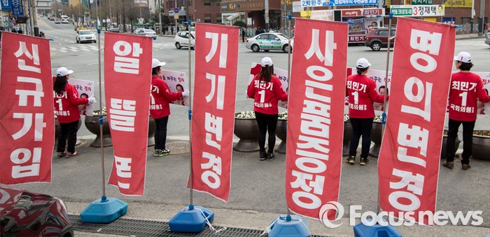(천안=포커스뉴스) 6일 오후 충남 천안 두정로에서 열린 최민기 새누리당 천안시을 후보 지원유세에서 선거운동원들이 붉은 현수막 사이에서 손팻말을 들고 있다.
