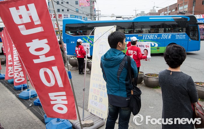 (천안=포커스뉴스) 6일 오후 충남 천안 두정로에서 열린 최민기 새누리당 천안시을 후보 지원유세에서 유권자들이 연설을 듣고 있다.