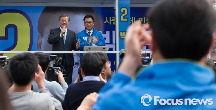 (수원=포커스뉴스) 6일 오후 경기 수원시 영통구 매탄1동 주민센터 앞에서 문재인 더불어민주당 전 대표가 박광온 더민주 수원시정 후보 지원유세를 하고 있다.