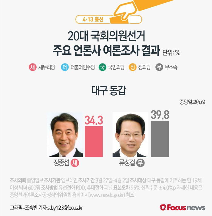 (서울=포커스뉴스) 중앙일보가 여론조사기관 엠브레인에 의뢰해 6일 발표한 결과에 따르면 대구 동갑에서 새누리당 정종섭 후보의 지지율은 34.3%, 무소속 류성걸 후보의 지지율은 39.8%인 것으로 나타났다.