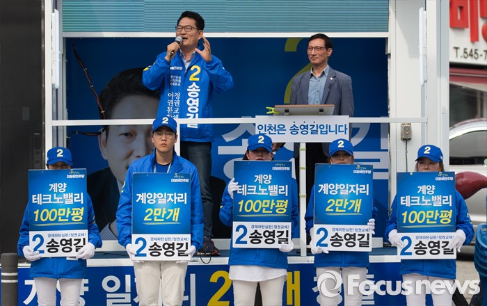 (인천=포커스뉴스) 제20대 총선에 출마한 송영길 더불어민주당 계양을 후보가 6일 오후 인천 계양구 계산역 앞에서 선거운동을 하고 있다.