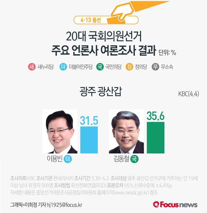 더불어민주당 이용빈 후보의 지지율은 31.5%, 국민의당 김동철 후보는 35.6%를 기록했다.