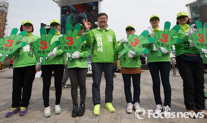 (인천=포커스뉴스) 제20대 총선에 출마한 최원식 국민의당 계양을 후보가 6일 오후 인천 계양구 계산역 앞에서 선거운동을 하고 있다.