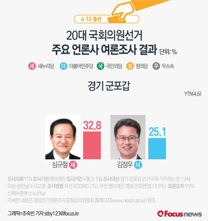 (서울=포커스뉴스) YTN이 여론조사기관 엠브레인에 의뢰해 6일 발표한 결과에 따르면 경기 군포갑에서 새누리당 심규철 후보의 지지율은 32.8%, 더민주 김정우 후보의 지지율은 25.1%인 것으로 나타났다.