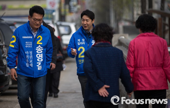 (인천=포커스뉴스) 제20대 총선에 출마한 송영길 더불어민주당 계양을 후보가 6일 오후 인천 계양구 계산역 앞에서 선거운동을 하고 있다.