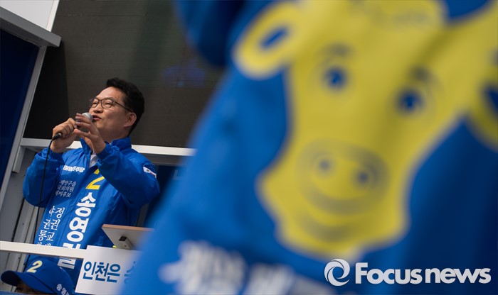 (인천=포커스뉴스) 제20대 총선에 출마한 송영길 더불어민주당 계양을 후보가 6일 오후 인천 계양구 계산역 앞에서 선거운동을 하고 있다.