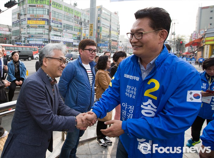 (인천=포커스뉴스) 제20대 총선에 출마한 송영길 더불어민주당 계양을 후보가 6일 오후 인천 계양구 계산역 앞에서 선거운동을 하고 있다.
