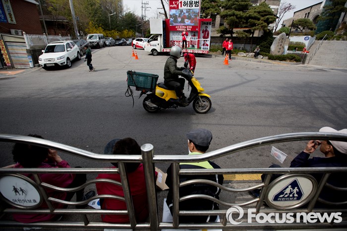 (서울=포커스뉴스) 허용범 새누리당 동대문구갑 후보가 6일 오후 서울 동대문구 제기동 일대에서 유권자들에게 소중한 한 표를 호소 하고 있다.