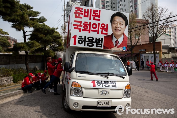 (서울=포커스뉴스) 6일 오후 서울 동대문구 제기동 일대에서 주민들이 태극기를 들고 허용범 새누리당 동대문구갑 후보의 선거운동원들이 선거운동을 마친 뒤 햇볕을 피해 휴식 하고 있다.