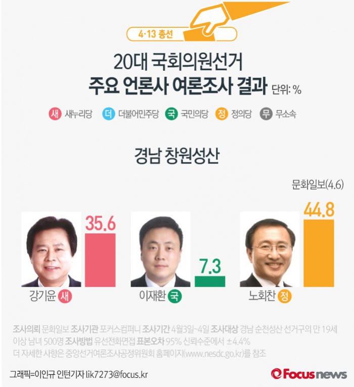 (서울=포커스뉴스) 문화일보가 여론조사기관 포커스컴퍼니에 의뢰해 6일 발표한 결과에 따르면 경남 창원성산의 지지율은 새누리당 강기윤 후보(35.6%), 국민의당 이재환 후보(7.3%), 정의당 노회찬 후보(44.8%) 순인 것으로 나타났다.