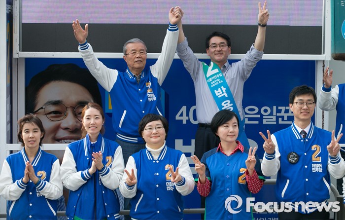 (서울=포커스뉴스) 6일 오후 서울 롯데백화점 미아점 앞에서 김종인(왼쪽) 더불어민주당 비대위 대표 겸 선대위원장과 박용진 강북을 후보가 손을 들어 인사하며 지지를 호소하고 있다.