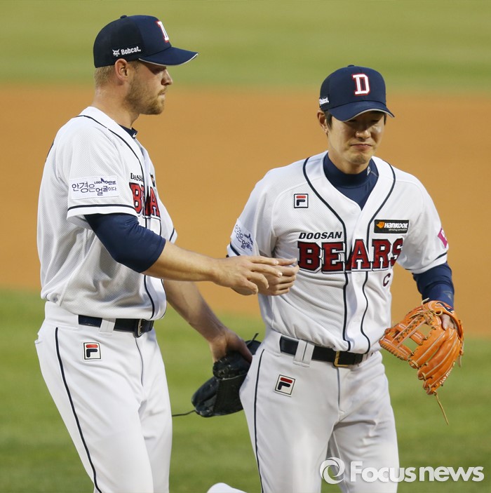 (서울=포커스뉴스) 6일 서울 잠실구장에서 열린 2016 프로야구 NC-두산 경기에서 1회초 두산 선발투수 보우덴이 수비를 마치고 들어 오는 김재호를 맞이하고 있다.