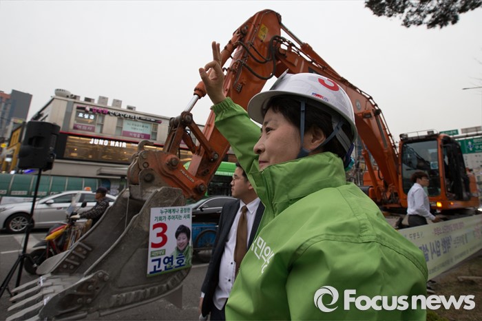 (서울=포커스뉴스) 6일 오후 서울 은평구 연신내 물빛공원에서 고연호 국민의당 은평구을 후보가 포클레인에 오르기전 안전모와 안전띠를 착용하고 시민들에게 지지를 호소하고 있다.