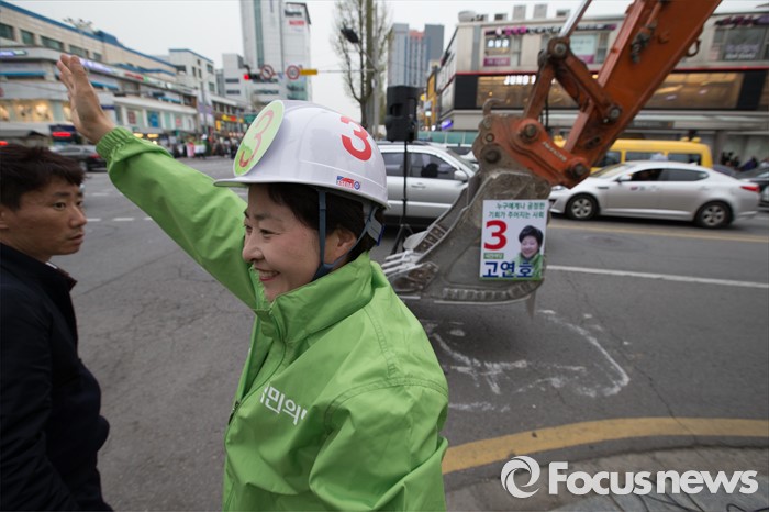 (서울=포커스뉴스) 6일 오후 서울 은평구 연신내 물빛공원에서 고연호 국민의당 은평구을 후보가 포클레인에 오르기전 안전모와 안전띠를 착용하고 시민들에게 지지를 호소하고 있다.