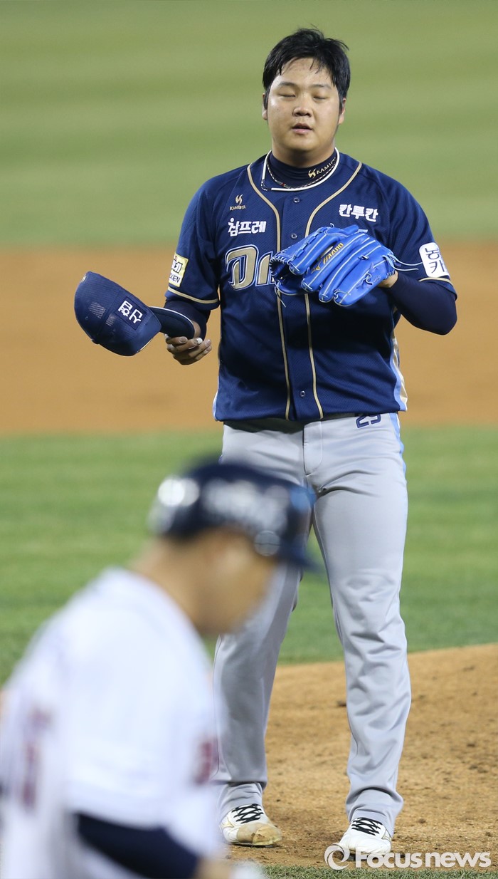 (서울=포커스뉴스) 6일 서울 잠실구장에서 열린 2016 프로야구 NC-두산 경기 2회말 NC 투수 이민호가 두산 선두타자 양의지를 몸에 맞는 볼로 내보내고 있다.