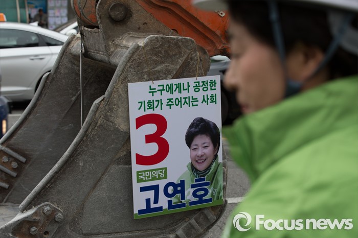 (서울=포커스뉴스) 6일 오후 서울 은평구 연신내 물빛공원에서 고연호 국민의당 은평구을 후보가 포클레인에 오르기전 안전모와 안전띠를 착용하고 시민들에게 지지를 호소하고 있다.