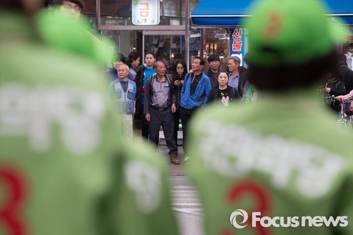 (서울=포커스뉴스) 6일 오후 서울 은평구 연신내 물빛공원에서 고연호 국민의당 은평구을 후보 지지자들 사이로 시민들이 횡단보도를 건너려고 기다리고 있다.